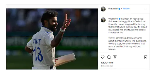 विराट ने लिखा, ‘टेस्ट क्रिकेट में पहली बार मैंने बैगी ब्लू जर्सी 14 साल पहले पहनी थी। ईमानदारी से कहूं तो मैंने कभी नहीं सोचा था कि यह फॉरमेट मुझे इस तरह के सफर पर ले जाएगा। इसने मेरी परीक्षा ली, मुझे पहचान दिया और मुझे ऐसे सबक सिखाए, जिन्हें मैं जीवन भर साथ रखूंगा।