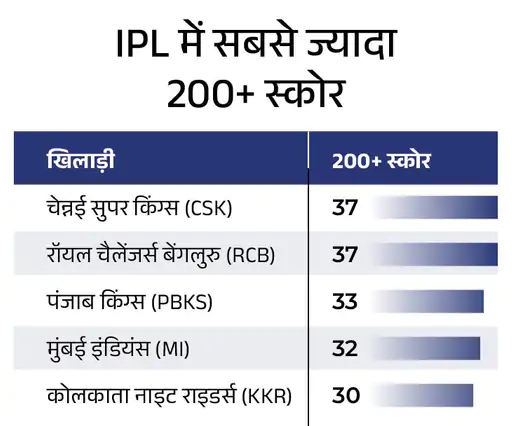 RCB ने IPL में 37वीं बार 200+ का स्कोर बनाकर CSK की बराबरी कर ली है। अब दोनों टीमें इस लिस्ट में संयुक्त रूप से पहले नंबर पर हैं। तीसरे नंबर पर PBKS (33) है, जबकि MI (32) चौथे और KKR (30) पांचवें स्थान पर हैं।