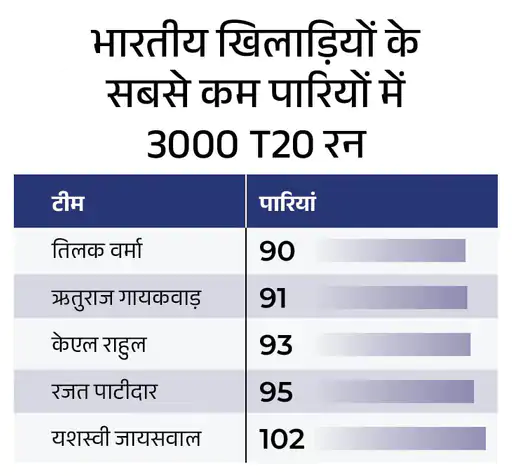 रजत पाटीदार ने 95 पारियों में 3000 T20 रन पूरे कर लिए हैं। वह इस लिस्ट में चौथे नंबर पर हैं। सबसे तेज 3000 रन का रिकॉर्ड तिलक वर्मा (90 पारियां) के नाम है, जबकि दूसरे नंबर पर ऋतुराज गायकवाड़ (91) और तीसरे नंबर पर केएल राहुल (93) हैं।