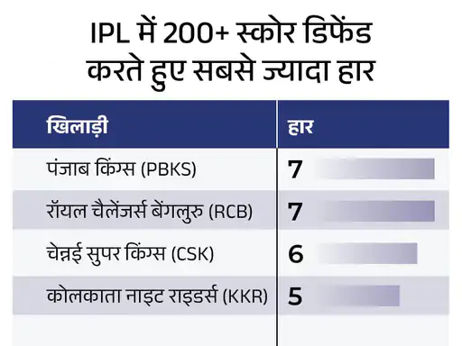 4. RCB 7वीं बार 200+ रन बनाकर हारी RCB ने 200+ स्कोर बनाने के बाद 7वीं बार मैच गंवाया, जिससे वह PBKS के साथ संयुक्त रूप से पहले स्थान पर पहुंच गई है। CSK 6 हार के साथ तीसरे नंबर पर है, जबकि KKR (5) चौथे स्थान पर है।